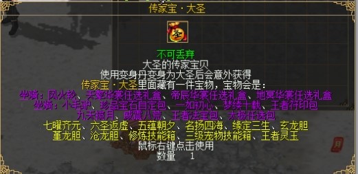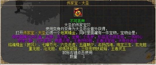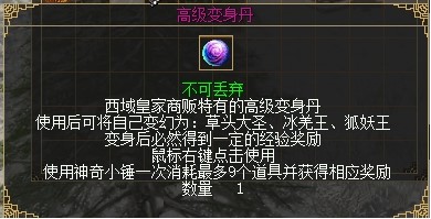 玩家使用高级变身丹会随机变为妖狐王、冰羌王、草头大圣其中一种,并获得经验奖励。