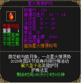 每个服务器第六到十名每人可获得绑定护符:星火燎原(60天),属性:防御105,攻击12-14,冰火毒攻各9-10,幸运21,生命上限1000,附加伤害10,追加星火燎原称号。