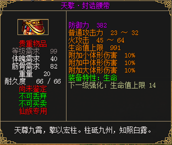 新种族:曦族。曦族无法使用其他人、妖、仙、羽、灵族的装备,只能使用本族自己的装备,包括:头盔、胸甲、鞋靴、披风、手套、护腕、腰带、扳指、项链等。
