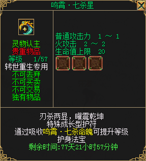 同时,3转修炼玩家还可以在西凉城(138,116)周复始处领取多种鸣霄季专属奖励。包括新型的可成长护符:鸣霄·七杀星,专属升级材料:鸣霄·七杀命魄,以及专属镶嵌石:鸣霄·七杀晶核。