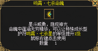 玩家使用鸣霄·七杀命魄便可以提升鸣霄·七杀星的等级,并使其属性不断提升,为玩家带来越来越强大的助益。鸣霄·七杀命魄可以通过参与鸣霄季玩法免费获得,也可以通过庙会购买超低折扣的鸣霄至尊护符宝匣获得,还可以购买鸣霄至尊命魄宝匣获得。