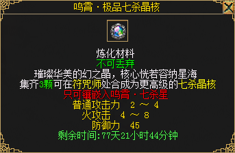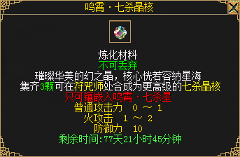 鸣霄·七杀晶核可通过炼化提升到更高等阶,3颗鸣霄·七杀晶核可升为鸣霄·上品七杀晶核,3颗鸣霄·上品七杀晶核可升为鸣霄·极品七杀晶核,3颗鸣霄·极品七杀晶核可升为鸣霄·珍品七杀晶核。各等级鸣霄·七杀晶核炼化、镶嵌、摘除均没有任何额外消耗,但摘除后将变为绑定。