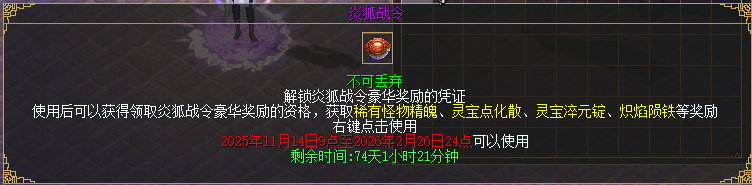 2025年11月14日至2026年2月5日,第2、4、...、10、12周的周六20:50至21:50,只穿戴了重燃季和鸣霄季装备、等级达到3转修炼、且所在帮会为5级帮或教派的玩家,便可以在神魔古战场(142,93)周复始处,参加天下第一帮·战火重燃活动。