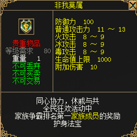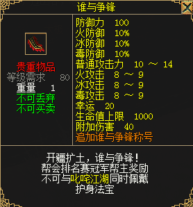 ②谁与争锋:防御力100,火、冰、毒防御各10%,普攻10~14,火、冰、毒攻各8~9,幸运20,生命上限1000,附加伤害40,追加谁与争锋称号。