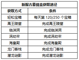 2025年11月14日开服后至2025年12月14日24点期间,两组新服80级以上的玩家参与指定任务可以获得绑定的“古墓锦盒”,礼包有效期为24小时。