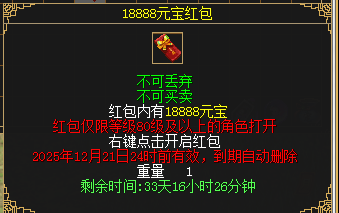 打开“古墓锦盒”后必得500银两和1个绑定的荧惑丹或者太白丹,同时有机会可以获得不同额度的“元宝红包”(非绑定,可以交易),使用元宝红包可以获得对应额度元宝,有机会获得18888元宝。