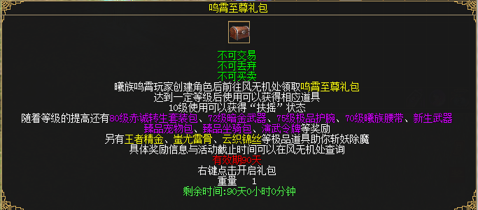 2025年11月14日至2026年2月28日24点,除当月新服外的其他正式服,新职业玩家可以前往“风无机”处领取鸣霄至尊礼包(绑定)(90天),限新职业使用。