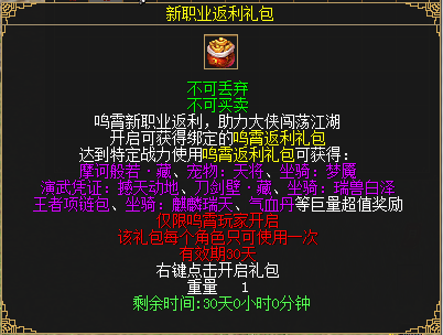 使用“新职业返利礼包”可以获得绑定的“鸣霄返利礼包”(有效期360天),达成相应战力后使用鸣霄返利礼包可获得对应奖励,全部奖励领取完成前,使用鸣霄返利礼包不会消耗鸣霄返利礼包。
