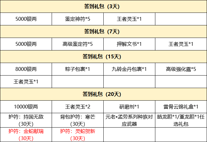 签到20天可得:10000银两,1个研磨剂,2个王者灵玉, 1个雷骨云锦礼盒,1个龙胆任选礼包,对应职业元老武器,背包护符:寒芒(30天),护符:持国无敌(30天),护符:金蛇献瑞(30天),护符:灵蛇贺新(30天)。