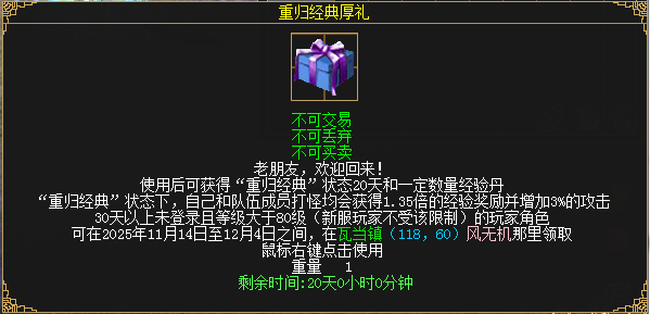 账号之前30天未登录,且角色等级≥80级的玩家,登陆游戏后可领取重归经典厚礼。