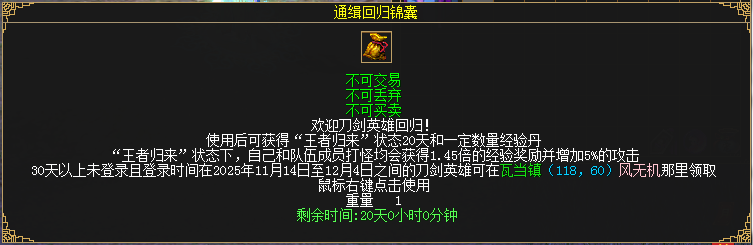 使用通缉回归礼包可获得王者归来光环,持续20天。20天内每天上线即可获得15点活跃值,与活跃玩家组队杀怪,均可获得1.45倍经验。并给队员和自己加5%物攻、5%元攻加成。同时将获得镇星丹*9、岁星丹*9、荧惑丹*35、太白丹*40以及“元老回归礼包”。当角色带有王者归来的光环时可叠加使用通缉回归锦囊,最多叠加60天状态。