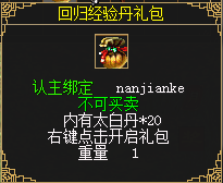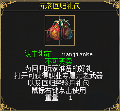 使用重归经典厚礼道具将会获得“重归经典”状态,有“重归经典”状态的玩家或者与此玩家组队的玩家将会获得1.35倍的杀怪经验,状态效果持续20天,持续20天内每天上线获得15点活跃值。并给队员和自己加3%物攻、3%元攻加成。同时将获得镇星丹*9、岁星丹*9、荧惑丹*35、太白丹*40以及“元老回归礼包”。