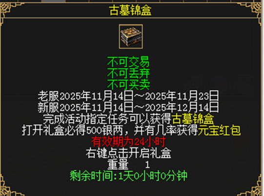11月14日至11月23日,老服参与以下指定任务可以获得绑定的“古墓锦盒”。
