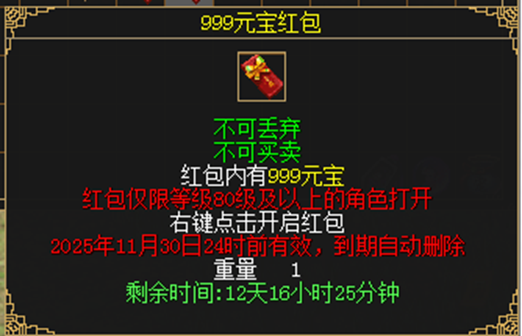 单个可交易元宝红包额度高达18888元宝,80级及以上的角色使用元宝红包可以获得对应额度元宝。12月21日24:00前,两组新服角色可使用该红包。11月30日24:00前,老服角色可使用该红包。