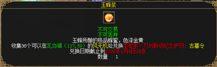 集齐36个玉蜂浆后即可在风无机处兑换李若彤联动专属纪念护符:古墓令,全服每个服务器前100名兑换护符:古墓令的角色,每个服均可瓜分20万元宝奖励。