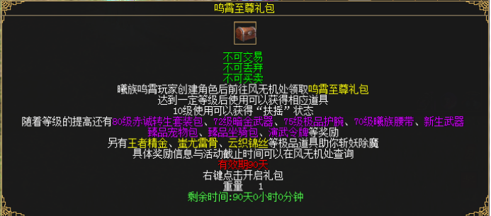 2025年11月14日至2026年2月28日24点期间,除当月新服外其他正式服,新职业玩家可以前往“风无机”处领取鸣霄至尊礼包(绑定)(90天),限新职业领取。