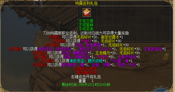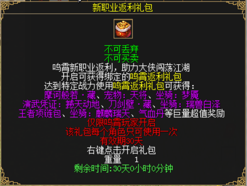 该礼包仅限新职业使用,且一个角色只能使用一次;使用“新职业返利礼包”后可以获得绑定的“鸣霄返利礼包”,达成相应战力后可获得对应奖励,战力越高,奖励越好!