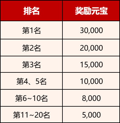 11月14日至11月23日24:00期间,除当月新服外其他正式服,每个服务器前20名到达3转修炼的新职业鸣霄玩家可以获得元宝奖励。